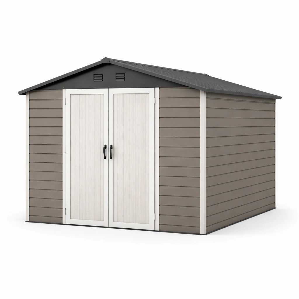 Materiales: Paredes de polipropileno de doble espesor, techo de polipropileno tratado. Puertas de resina con bisagras metálicas.