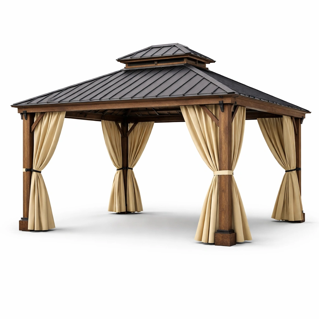 Gazebo de madera y acero galvanizado con cortinas de poliéster beige