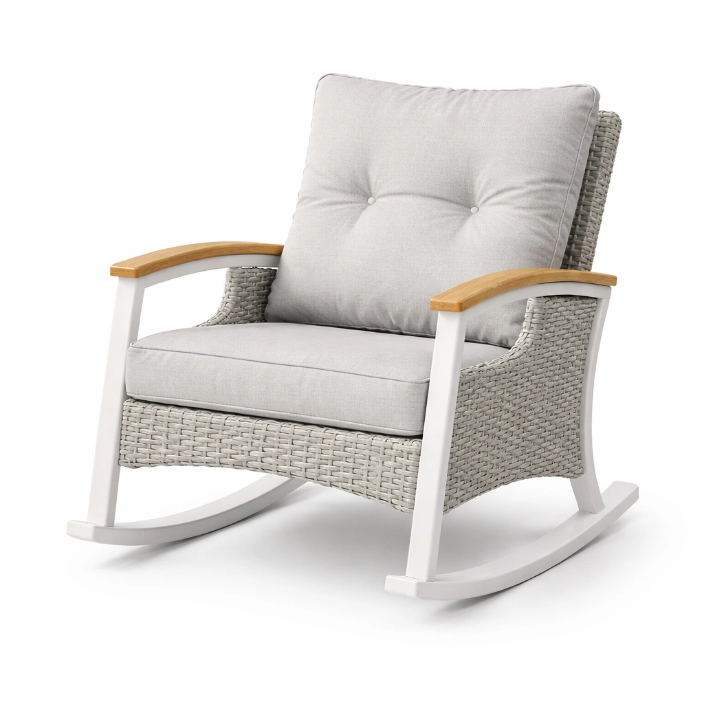 La estructura principal de esta silla mecedora está hecha de aluminio con recubrimiento en polvo, proporcionando durabilidad y resistencia. La superficie está adornada con ratán sintético en color gris.